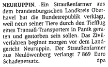 Nächste sein, der die Bundesrepublik verklagt. Wenn nämlich nachts die Flieger beim Landeanflug über meinem Haus dröhnen, beginnt mein Hund so kräftig zu heulen, daß ich um den Schlaf gebracht werde … und das schon seit Jahren. Ich muß mir nur noch ausrechnen lassen, wieviel Schadenersatz man für eine schlaflose Nacht einfordern kann. Auf jeden Fall werde ich diesmal nicht mehr den Vorschlag akzeptieren, ich solle doch einfach den Hund abschaffen. [#56]